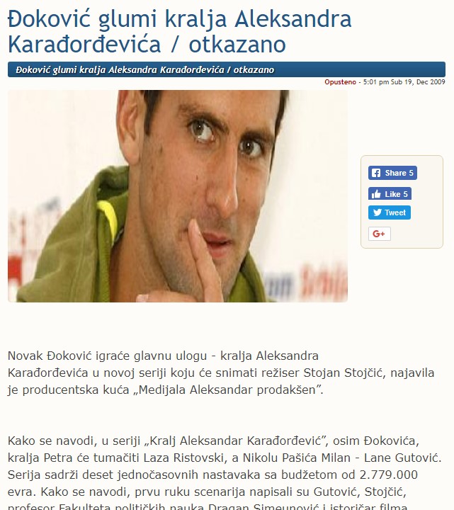 Занимљиво је да су четири године раније, у децембру 2009. године таблоиди, али и тзв. озбиљни медији и агенције, пренели вест са сензационалним насловом „Новак Ђоковић играће краља Александра Карађорђевића“.