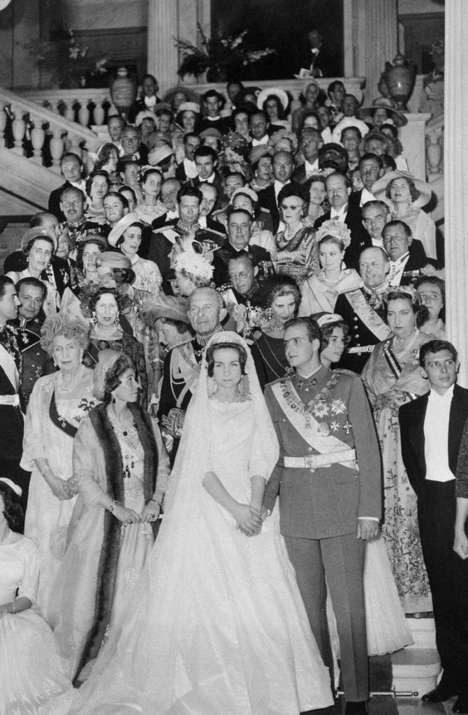Грчка принцеза Софија и тада будући краљ Шпаније, Хуан Карлос, венчали су се 1962. године и то у два обреда – православном и католичком. Софија је носила венчаницу једноставног кроја од сребрнасте свиле, прекривене чипком са шлепом од готово шест метара. Младину хаљину дизајнирао је Жан Десес. Чипкани вео наследила је од мајке, краљице Фредерике. На глави је носила пруску дијамантну тијару, дар њене баке – принцезе Викторије Луисе од Пруске.
