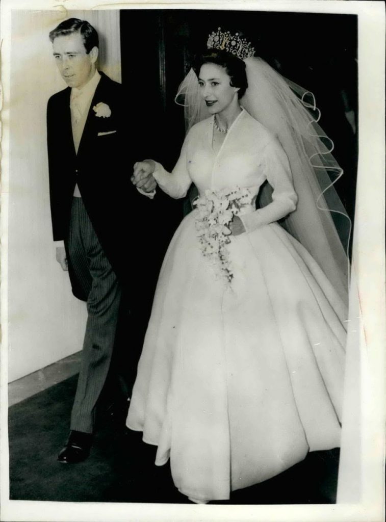 Елизабетина млађа сестра принцеза Маргарет и фотограф Тони Армстронг венчали су се 1960. године у Вестминстерској палати. Венчаницу од сребрнасте органди свиле креирао је Норман Хартнел. Како је млада била веома ситна и ниска, висине само 152 сантиметра, младожењина жеља је била да хаљина не „прогута“ Маргарет и тако умањи њену лепоту и грациозну фигуру. Маргарет је одговорила да младожењу „воли као Бога“ и да без размишљања пристаје на његов избор.